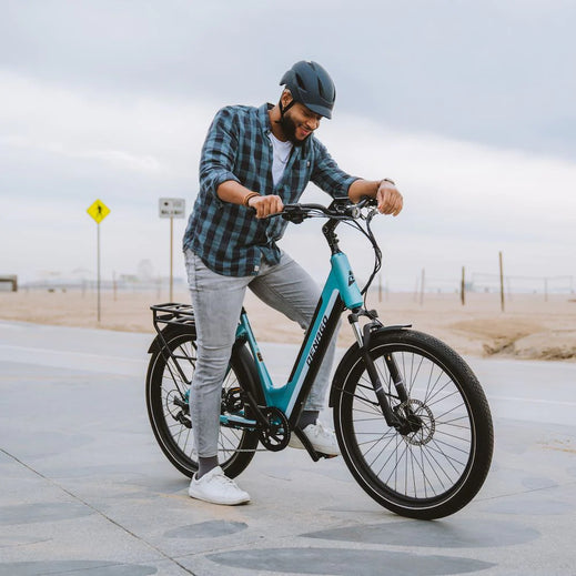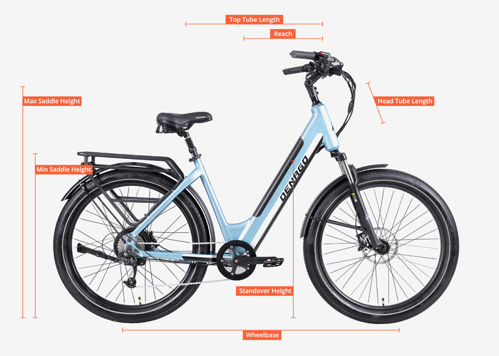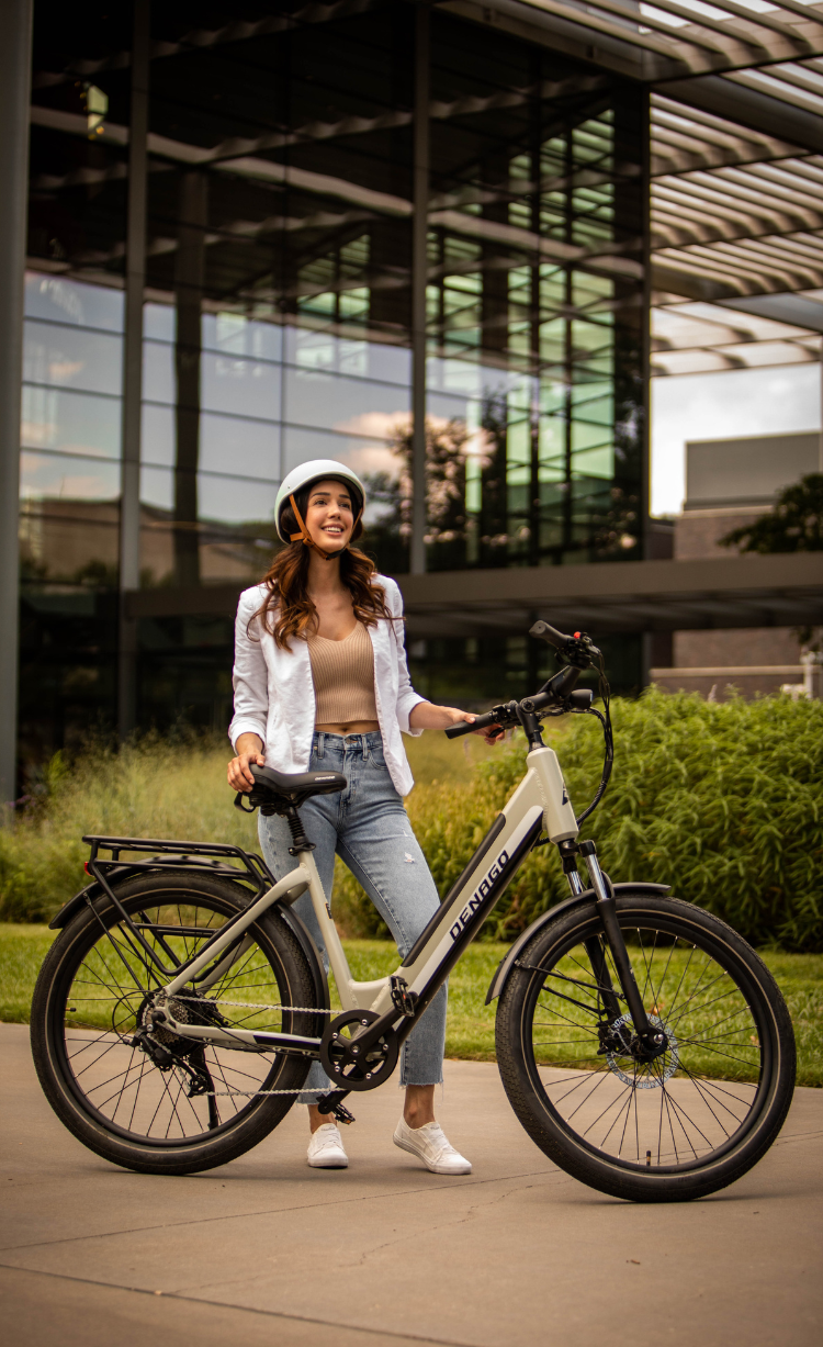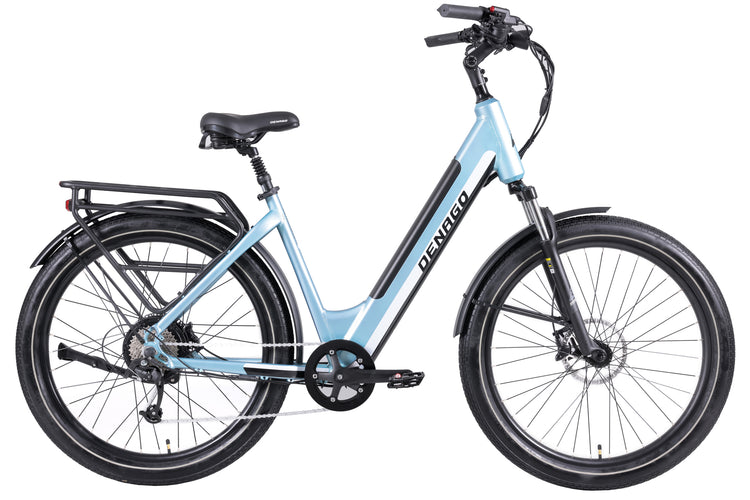 The Denago Commute Model 1 is an urban eBike with a step-thru frame with a low standover height - easy to mount and dismount for shorter riders or those with poor flexibility or injuries. Commute Model 1 is full-featured with a suspension fork and seatpost, integrated headlight, plus included fenders, rear rack, and kickstand. Stealthy, sleek battery integrated with the down tube.