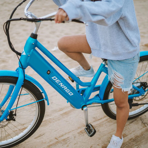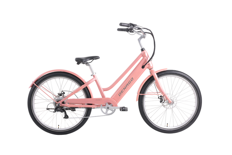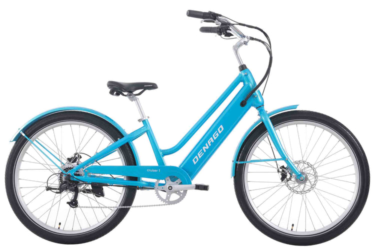 Cruise the beach boardwalk or bike path in style with the Denago Cruiser 1 Step-thru.It features a classic look and comfortable, upright riding position with a padded saddle and high-rise handlebar. A fun electric bike that anyone can jump on and ride, guaranteed to make you smile! Cruiser 1 offers both pedal assist and throttle modes, so you can choose how to ride. The step-thru frame style is ideal for riders with shorter inseams or those who have difficulty throwing a leg over the saddle.